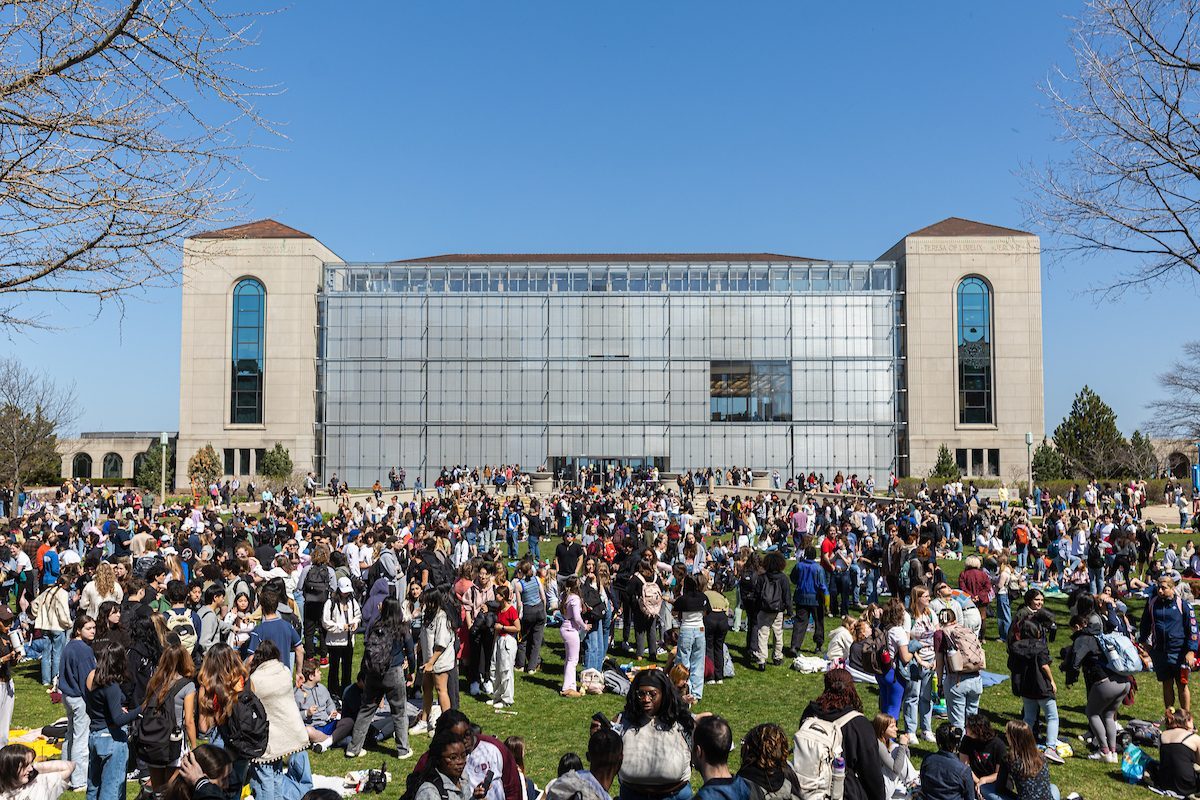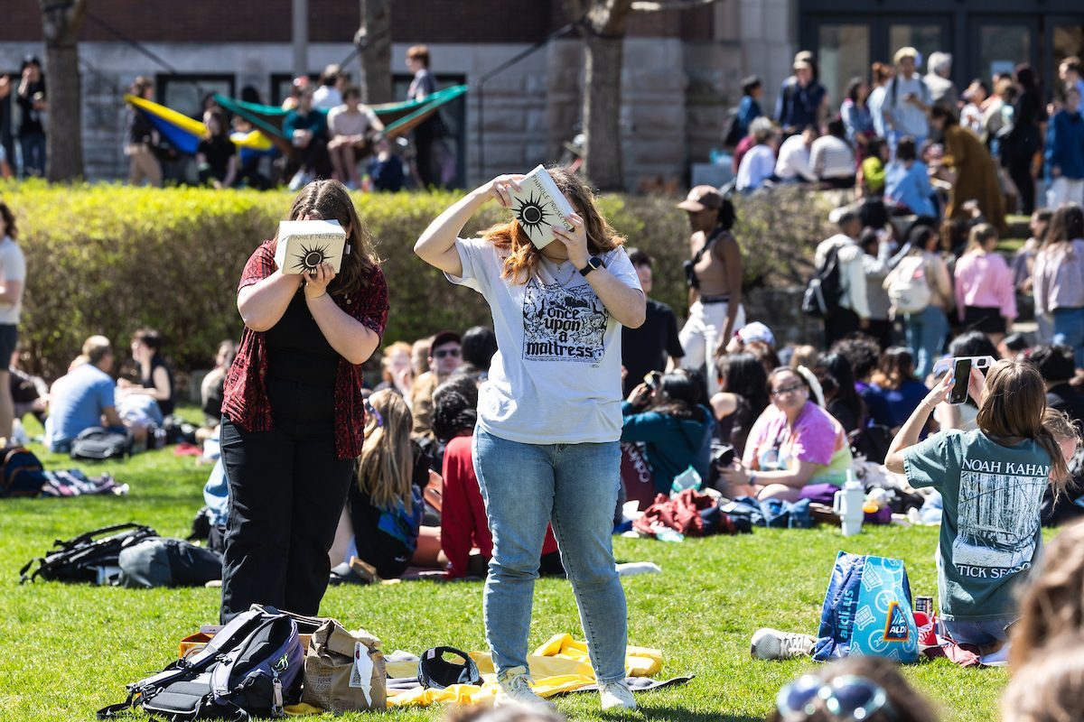 On April 8, hundreds of members of the Loyola community came outside to view the solar eclipse. Students gathered on the east quad and elsewhere on campus to celebrate a rare celestial moment on one of the warmest days of spring thus far. At 2:07 p.m., Chicago experienced peak coverage—93.9%. The sky grew dark, the temperature dropped and the crowd cheered.